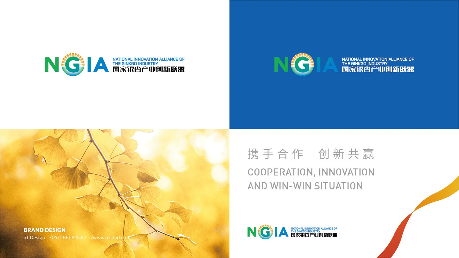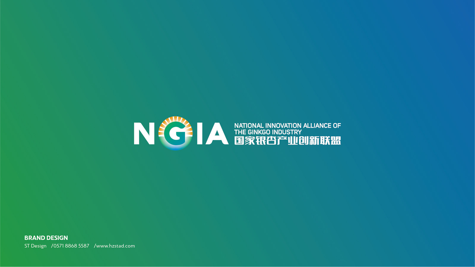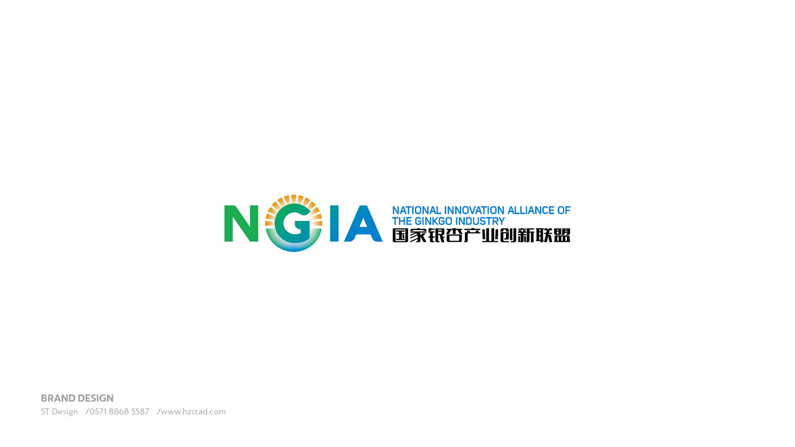 石特根據新成立的銀杏創新聯盟需求,未來發展的規模以及企業定位為其設計產業LOGO。在LOGO的設計上,以銀杏聯盟的英文縮寫“NGIA”為設計主體,表明主旨。利用大寫字母“G”的外形特點,與圖案相結合,圖案如早晨初生的太陽從高山上緩緩升起,點明銀杏創新聯盟如同太陽一般熾熱,蘊含能量,從最低處慢慢走向最高處,隱喻銀杏創新聯盟作為后起之秀的蓬勃生機。在顏色的選擇上,采用以藍色、綠色為主,橙色為輔,藍色代表天空、干凈,綠色代表森林、天然,橙色代表陽光、希望,深刻的表達出銀杏創新聯盟的初衷。
