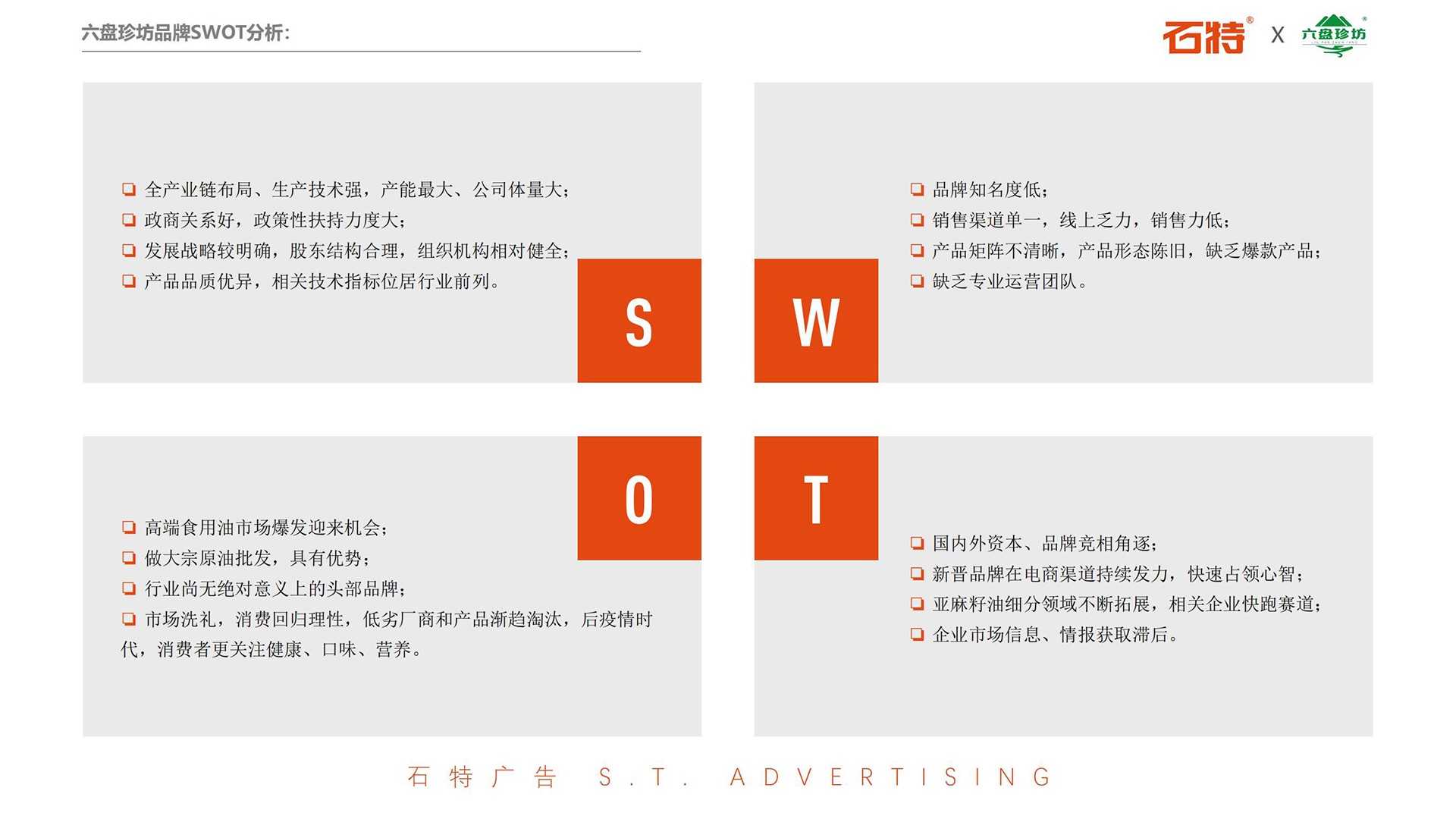 石特廣告在進(jìn)行實(shí)地考察時(shí),走訪了亞麻花的種植地、生產(chǎn)廠區(qū)、辦公區(qū)域,并查閱了相關(guān)資料,分析得出了六盤(pán)珍坊的目標(biāo)市場(chǎng)、品類趨勢(shì)、市場(chǎng)形態(tài)和競(jìng)爭(zhēng)環(huán)境,并結(jié)合對(duì)品牌的SWOT分析,梳理并聚焦了企業(yè)目前存在的問(wèn)題。