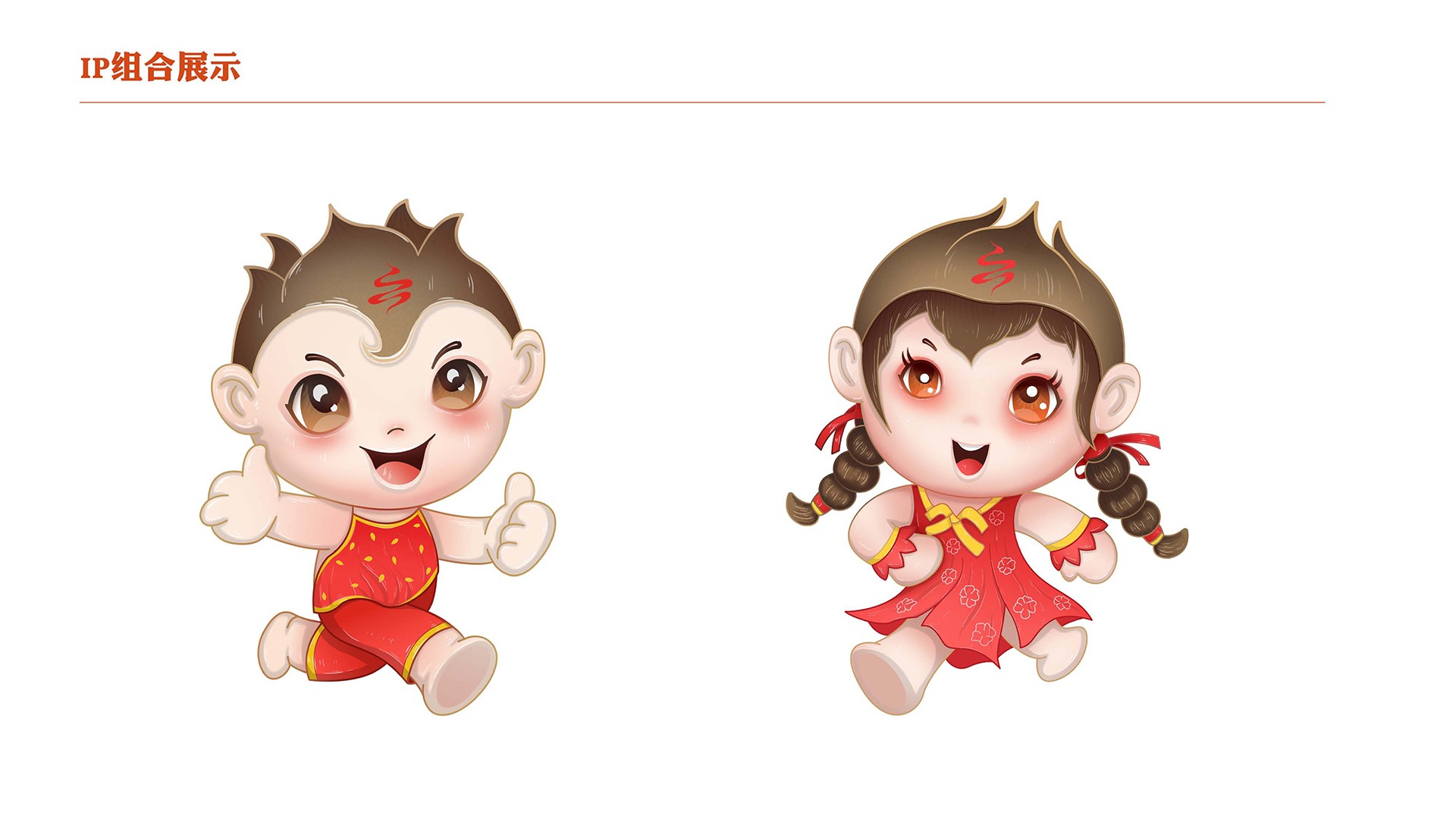 2、地域特征:從面貌出發(fā),為冷娃的填充緋紅的臉頰,凸顯高原地勢(shì);并給男娃設(shè)計(jì)紅肚兜以體現(xiàn)西北特色。