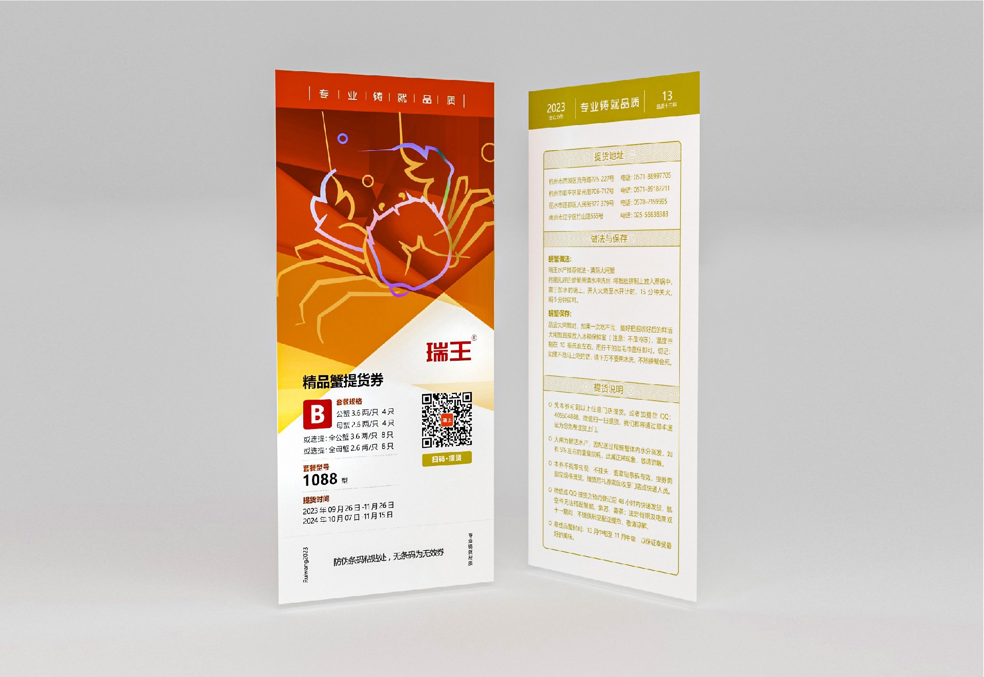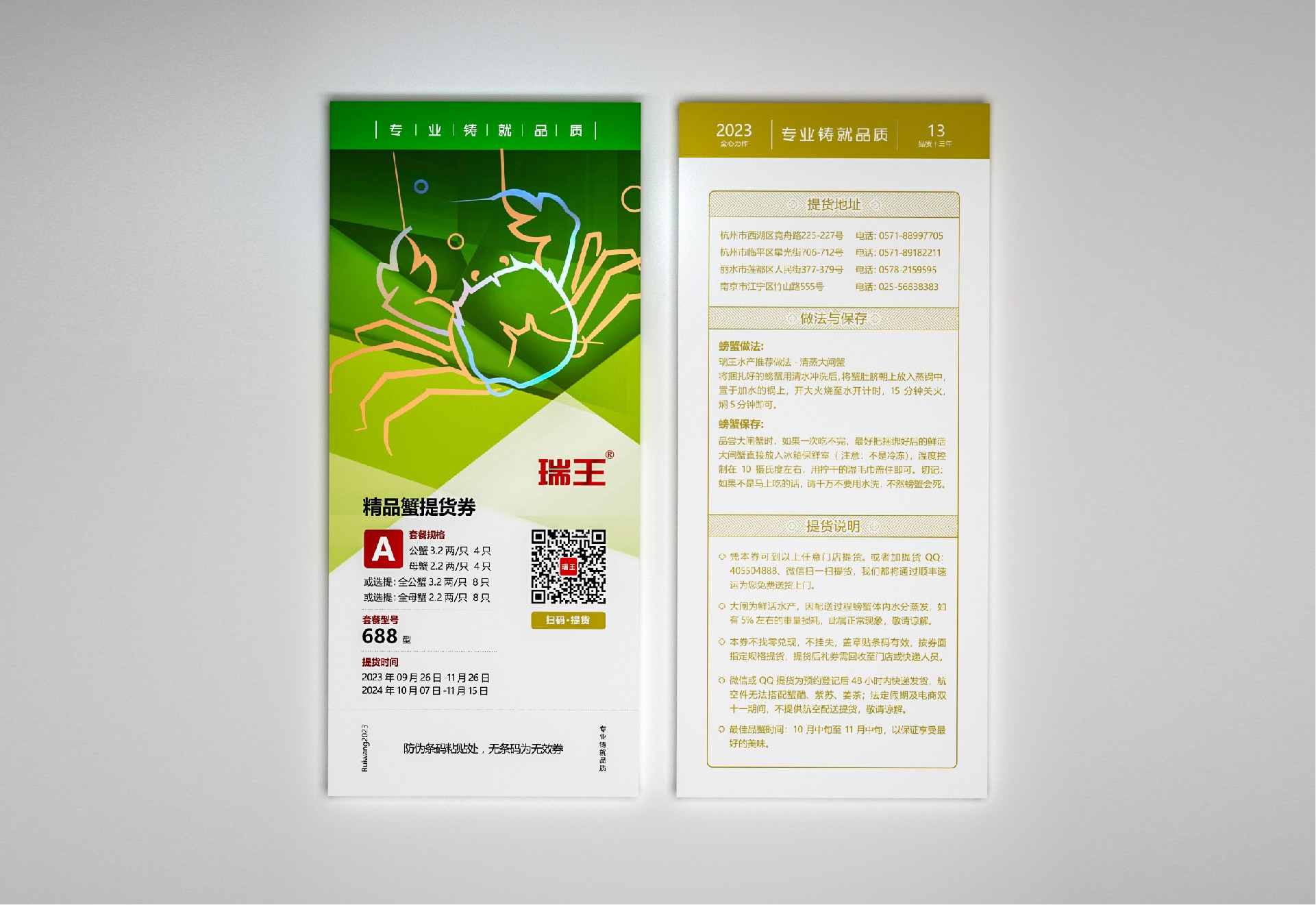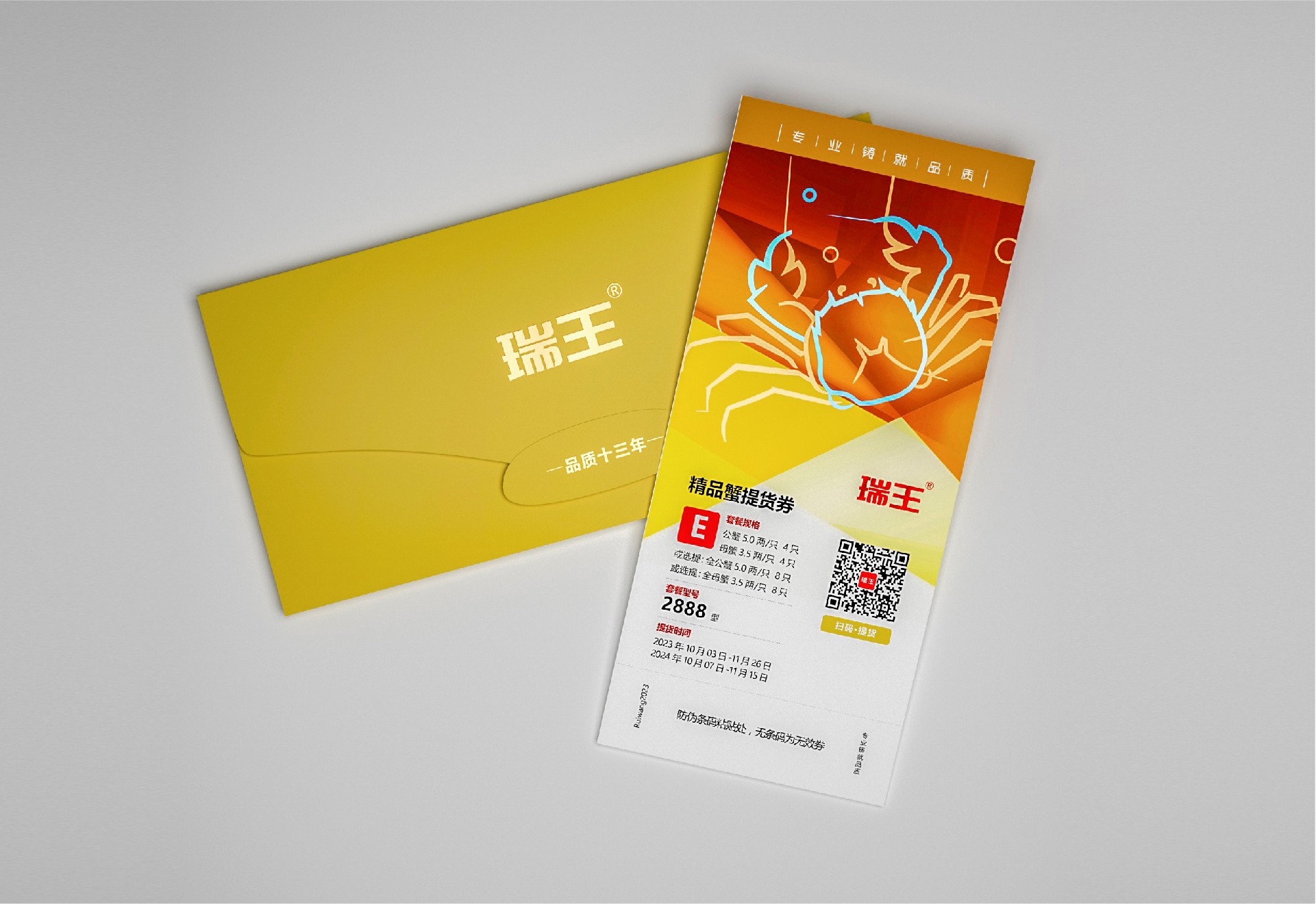 采用信封式包裝,以黃色為主色調,代表大閘蟹的鮮美。在信封的正面上部印有瑞王大閘蟹的LOGO,以突出品牌形象,并附上“品質十三年”的口號,展示企業的信譽度。