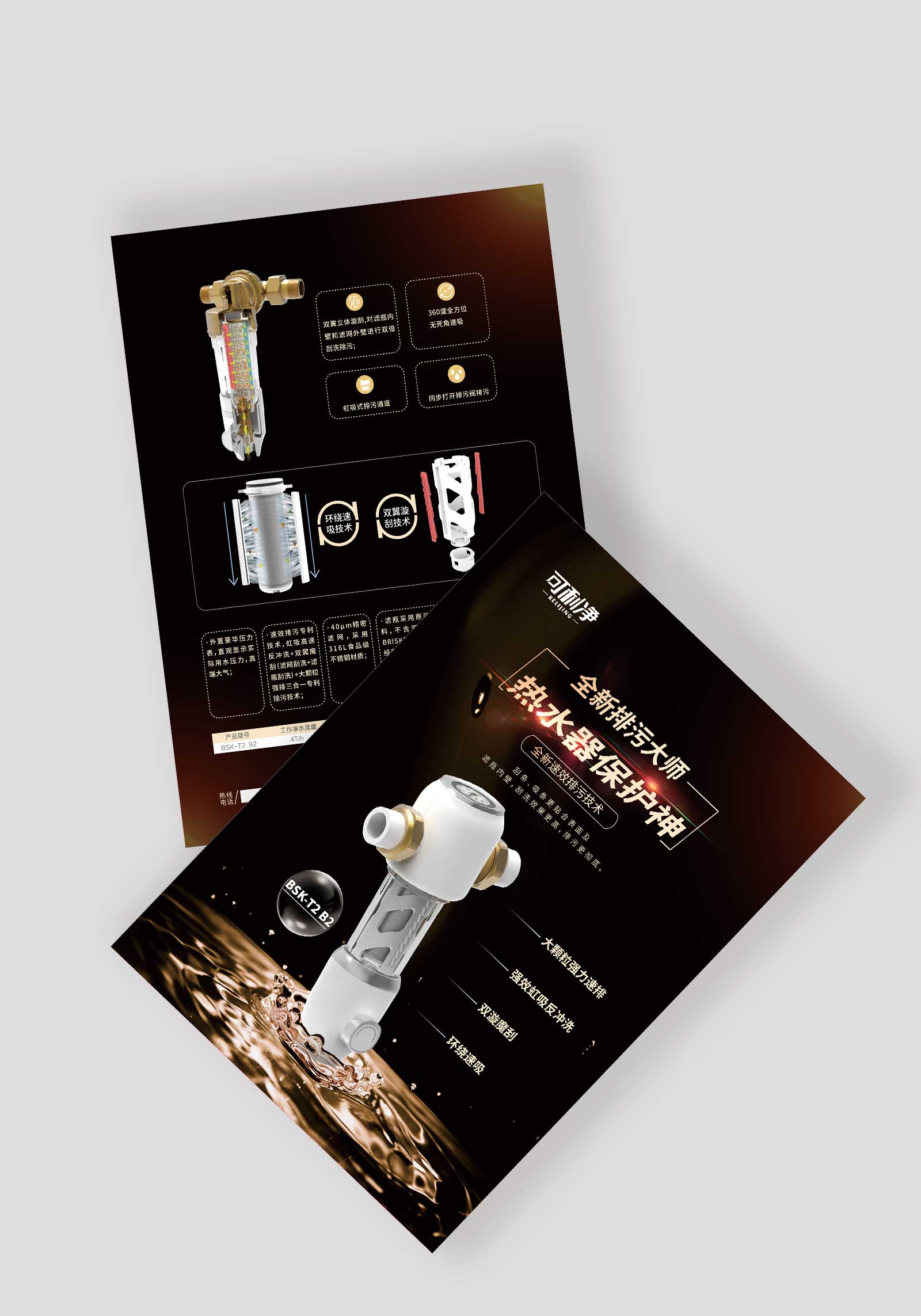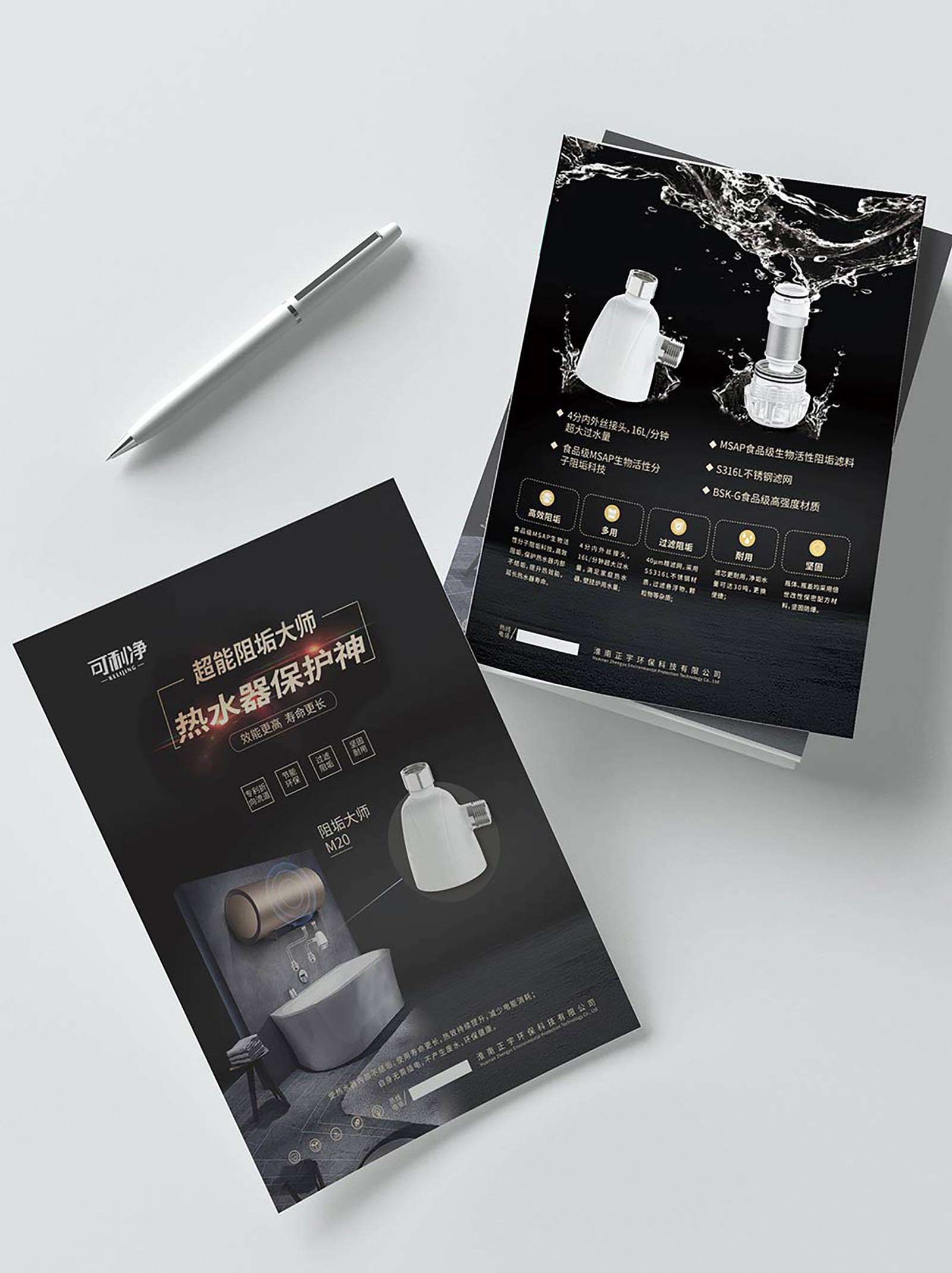 LOGO設(shè)計(jì),字體筆畫橫平豎直,但筆鋒圓潤,表現(xiàn)出金屬感的同時,也表現(xiàn)出浴室水的感覺,是一種堅(jiān)硬和柔軟的矛盾結(jié)合;單頁設(shè)計(jì)以暗色為主,突出產(chǎn)品特性,再加以高光點(diǎn)綴,顯得整體買點(diǎn)突出及優(yōu)勢。