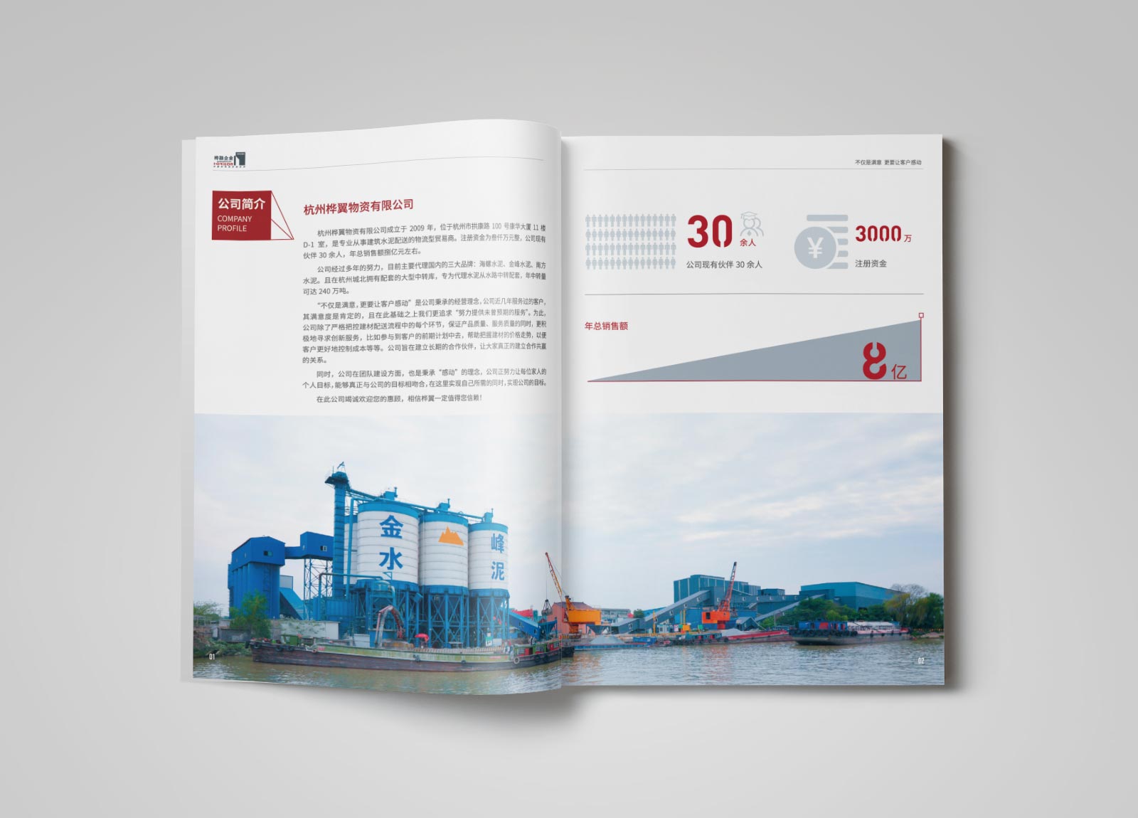 設計師根據企業LOGO的形狀,企業的行業屬性,鏡像畫冊版面設計,畫冊整體風格偏硬朗,畫冊中會根據文案進行小圖標設計,豐富畫面,突出數據。