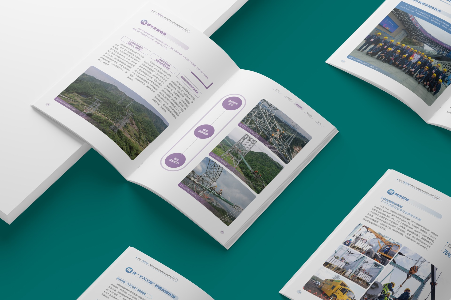 項目團隊立足"電助共富"核心主題,通過模塊化版式設計、數據可視化呈現及場景化案例解析,將專業電力服務轉化為通俗易懂的視覺語言。封面采用水墨山巒與電路脈絡融合設計,象征傳統與現代的共生發展,內頁以藍綠色系為主調傳遞清潔能源理念,展現電力服務與生態文明的深度協同。