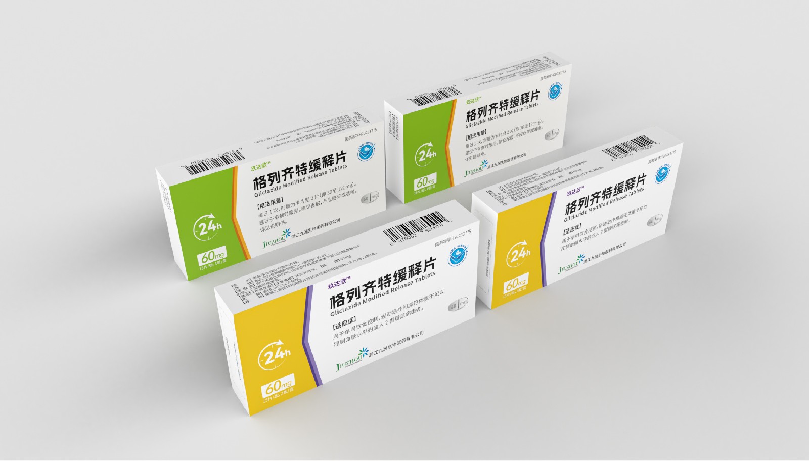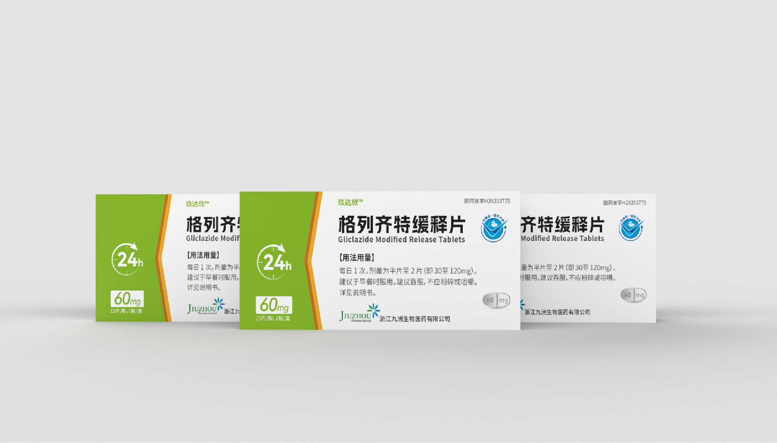 設計方案中藥效持續時間作為視覺符號出現,起到強調藥突出作用。強調用法用量與藥效持續時間數字“1”、“24”做傾斜處理體現速度感,在起到突出強調的同時,也體現藥片控制血糖速度之感。企業標志和企業名稱結合使用突出企業形象。藥片設計突出單片藥劑量和藥片可掰片使用。
