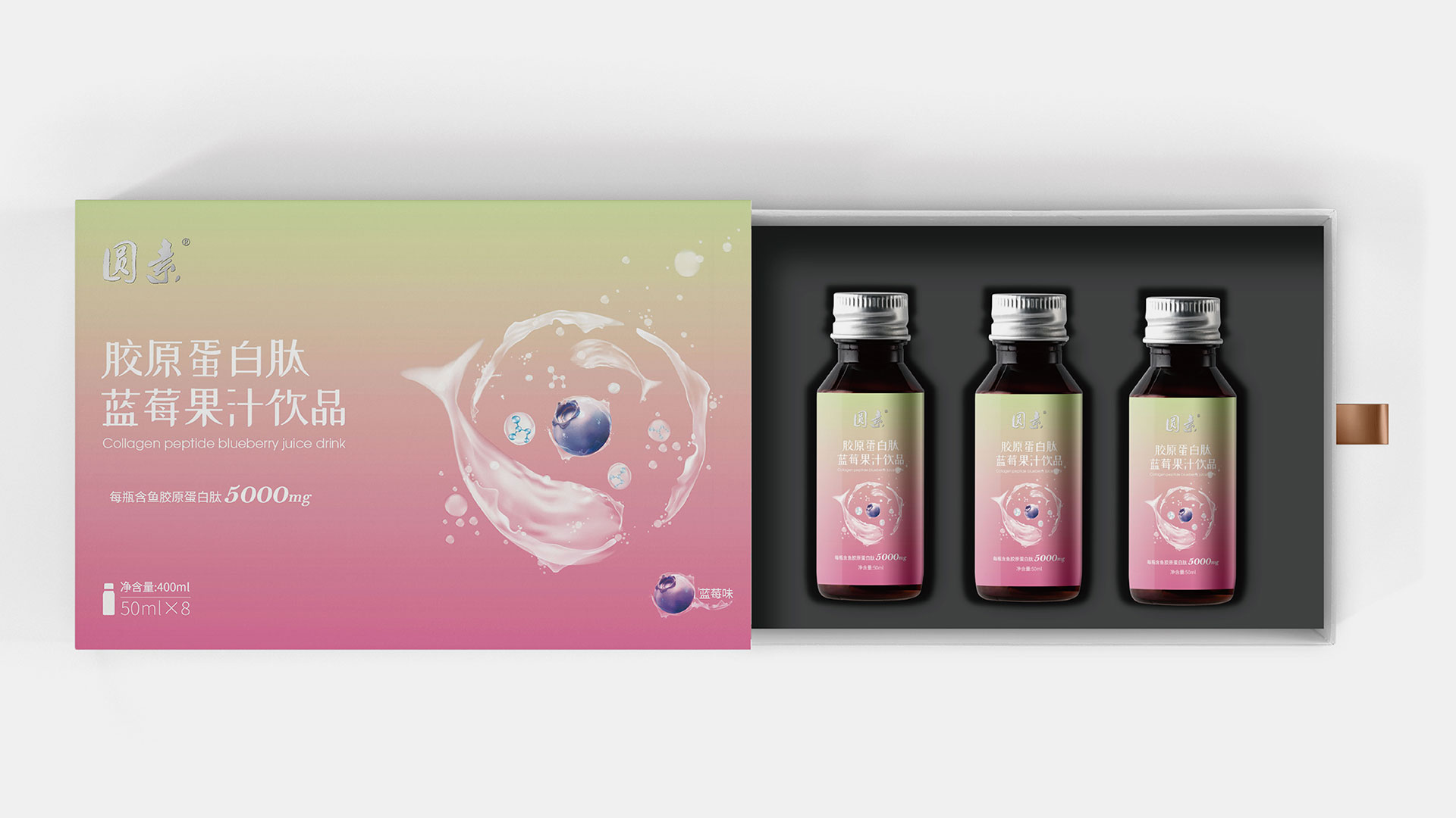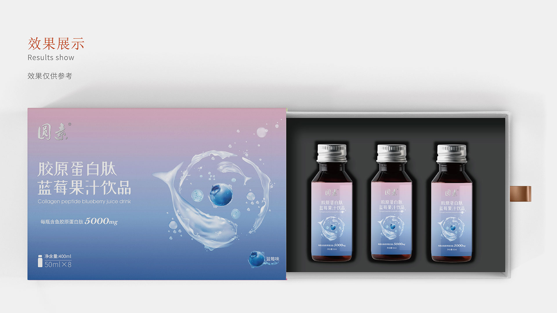 為能更好的突出藍(lán)莓濃縮果汁產(chǎn)品特性,根據(jù)品牌調(diào)性,石特在包裝上提出兩種方案:方案一:該款包裝以深海魚環(huán)繞藍(lán)莓游泳作為主畫面,其中深海魚以水狀的形態(tài)進(jìn)行呈現(xiàn),水滴融入分子式的元素,凸顯果汁飲品成分提取自深海魚的魚膠原蛋白;同時(shí)選取藍(lán)紫漸變色作為主色調(diào),年輕且時(shí)尚,包裝整體干凈簡(jiǎn)潔。