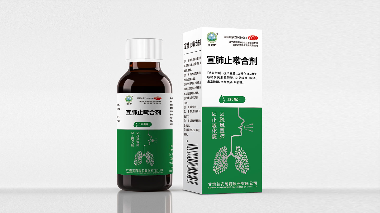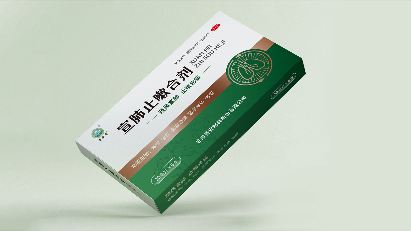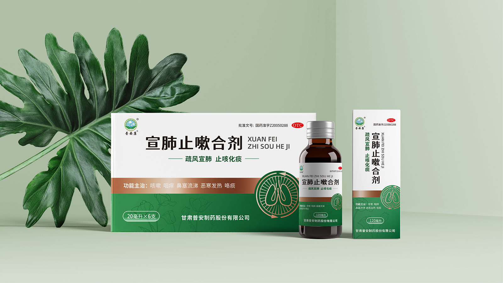 包裝整體風格以極簡為主,在凸出產品通用名的同時,將產品核心主治功能——疏風宣肺、止咳化痰以簡潔圖案展示于畫面,并作為畫面核心視覺元素。產品成分以中草藥為主,又聯想到產品功能主治特征,顧將兩者結合,用代表中草藥的樹葉和肺的整體形態進行融合、替換,凸顯產品中成藥屬性,將肺、呼吸道、人物側臉剪影和代表呼吸感的小點相結合,呼應產品主治功能特征。考慮到產品性狀為液體形態,因此將代表液體的水滴形態融合畫面和產品規格相結合,并做強調處理,凸顯產品性狀的同時以便于消費者準確查看及區分產品不同規格。