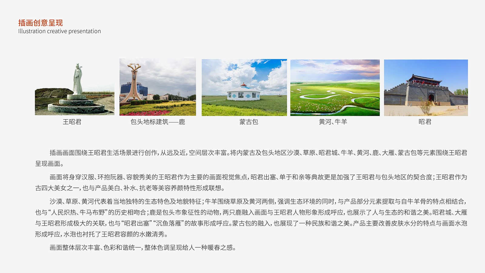 方案一設計元素展示王昭君及包頭地理特色,采用襯線字體,彰顯女性柔美特性,畫面整體干凈簡潔,插畫與文案部分以黃金比區分,整體更加和諧統一。
