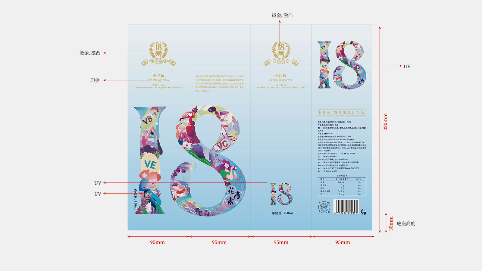 石特根據客戶要求與LOGO的形象進行瓶貼和包裝盒設計。就像品牌名“疆域18莓”將陌生的事物用大家熟知的觀點表示出來,將產品養生美容屬性,用“18”這個年輕、美好的數字表現出來,那石特就從品牌傳播的角度,將“18”象征著活力,年輕,美好的含義在包裝上展示出來。石特一共設計了三個方案,分別是寶石藍,雪花白,漸變藍三種風格,包裝上進行了工藝設計,表現出包裝的質感。方案一,寶石藍:藍色沉穩大氣,高貴優雅,寶藍色的包裝盒再進行特殊工藝更加凸顯了產品的質感,大面積的藍色與金色的LOGO標識相互襯托和諧又突出品牌名,展示產品可靠之感。方案二,雪花白,純潔的白色表達了產品的純真,純正,像“18”歲純真、美好。方案三漸變藍:根據LOGO形象色彩,進行包裝色彩的設計,與瓶貼風格相呼應,漸變的形式表現出活潑的含義,同時表達了了產品具有抗氧化,讓皮膚,身體,保持活力健康的屬性,與品牌名含義相符。三個包裝設計方案各有千秋,但都完整的表現了產品特有屬性與品牌獨特的形象。