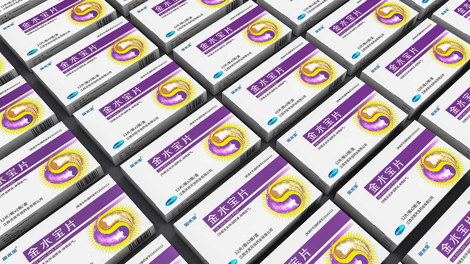 運用了太極陰陽兩儀的元素,作用于人體,表示調和、平衡,達到健康的身體狀態,符合濟民可信企業理念,跟品名五行學說的由來一脈相承;背景的太陽代表“金”,陰陽兩儀整體呈水流動狀態,寓意“水”;此外把腎和肺圖形加入進去,加以書法字體的藥效說明,闡明金水寶作用于人體哪些器官及主要功效;色調選取“腎上腺素紫”和“肺紅”,時尚吸睛又大氣穩重,符合品牌調性規范和創意表達。