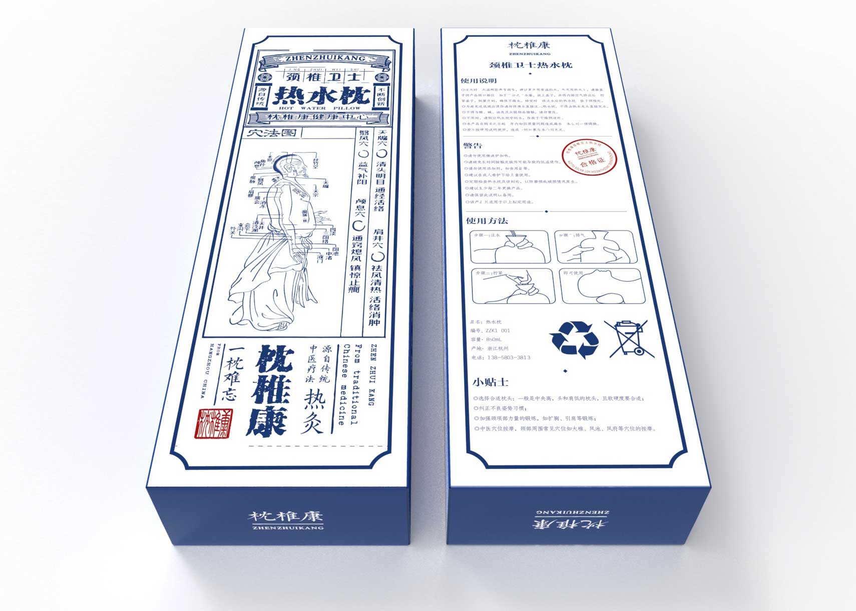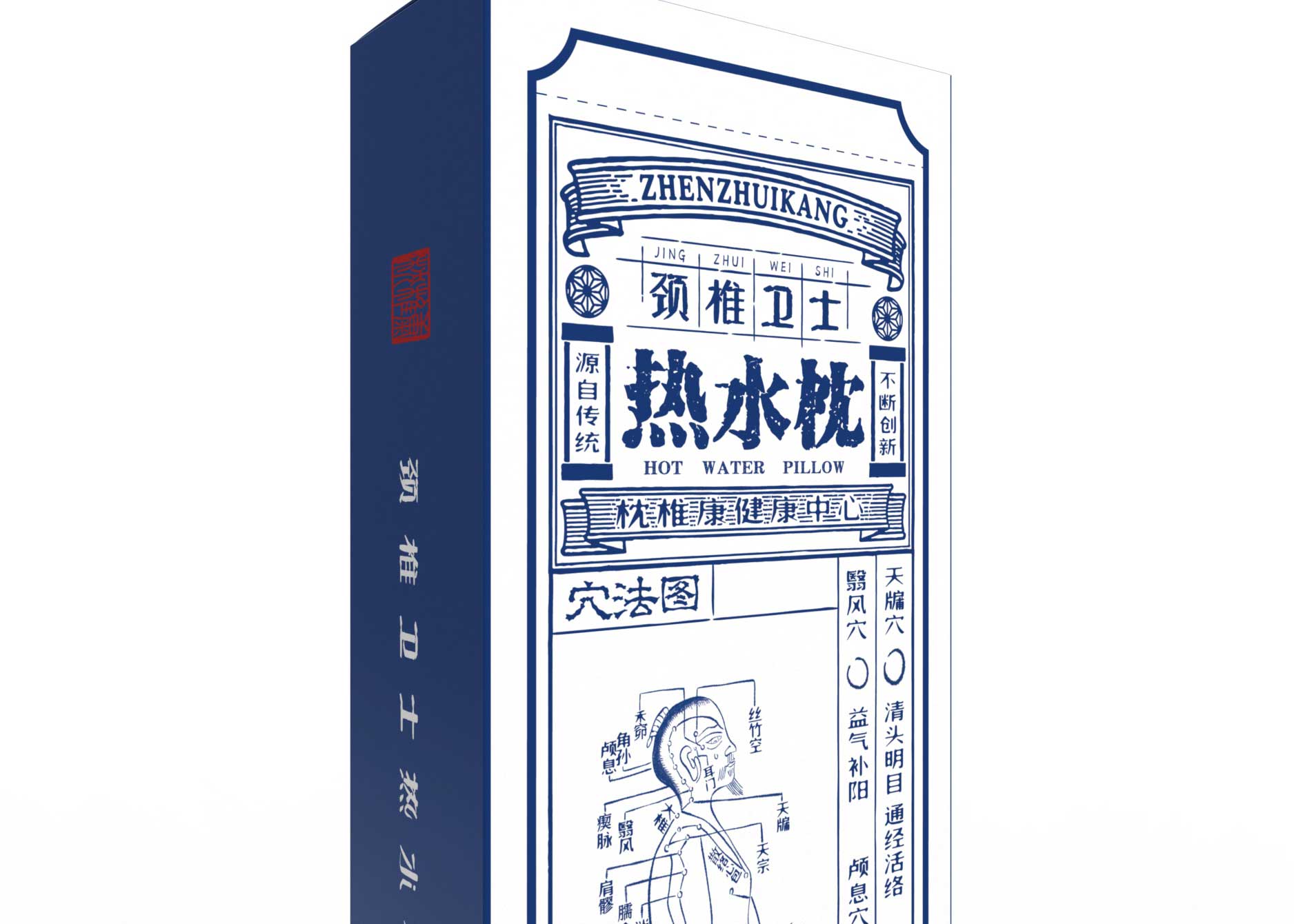包裝上繪有人體穴法圖,將傳統(tǒng)的中醫(yī)療法淋漓盡致的表達(dá)出來,同時(shí)繪有使用方法示意圖,這樣購(gòu)買者使用比較方便。除了使用說明及警告這些常規(guī)文字產(chǎn)品包裝上還放有頸椎小貼士讓購(gòu)買者感覺既貼心又實(shí)用。產(chǎn)品包裝主題顏色是藍(lán)色,向購(gòu)買者傳達(dá)一種健康的理念。
