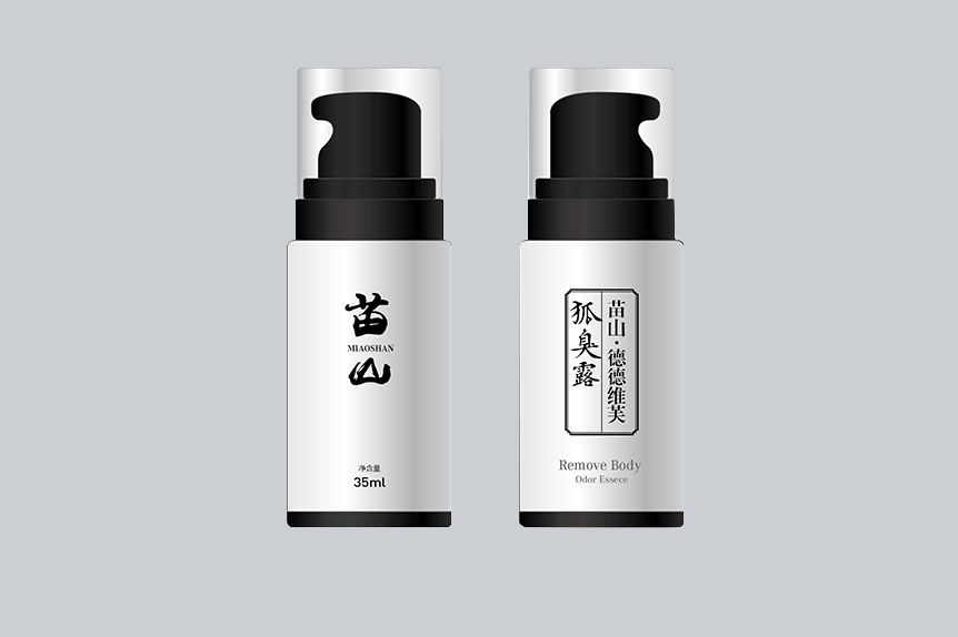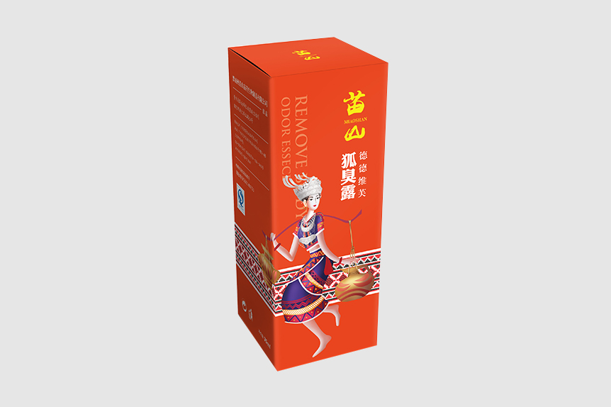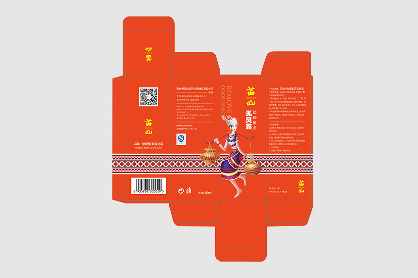 苗山狐臭露的包裝圖案設計為一個苗族女子挑了兩壇酒,處于一片紅色背景中。整個包裝看起來給人一種吉祥之兆,一般藥品包裝都比較冷色調,這里給人暖的感覺。里面的瓶子外形小巧精致,采用經典的黑白色給人一種沉穩感。
