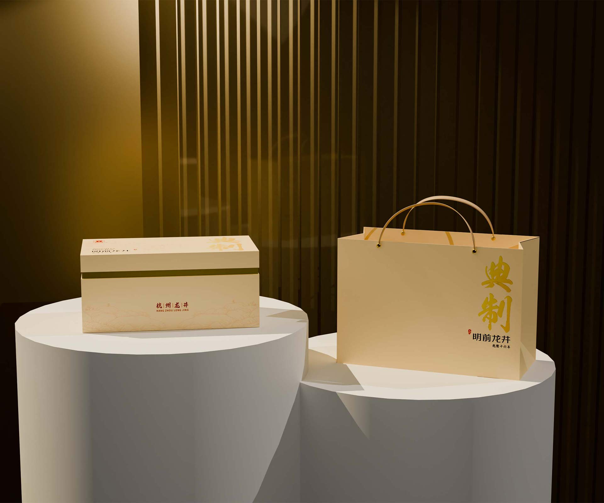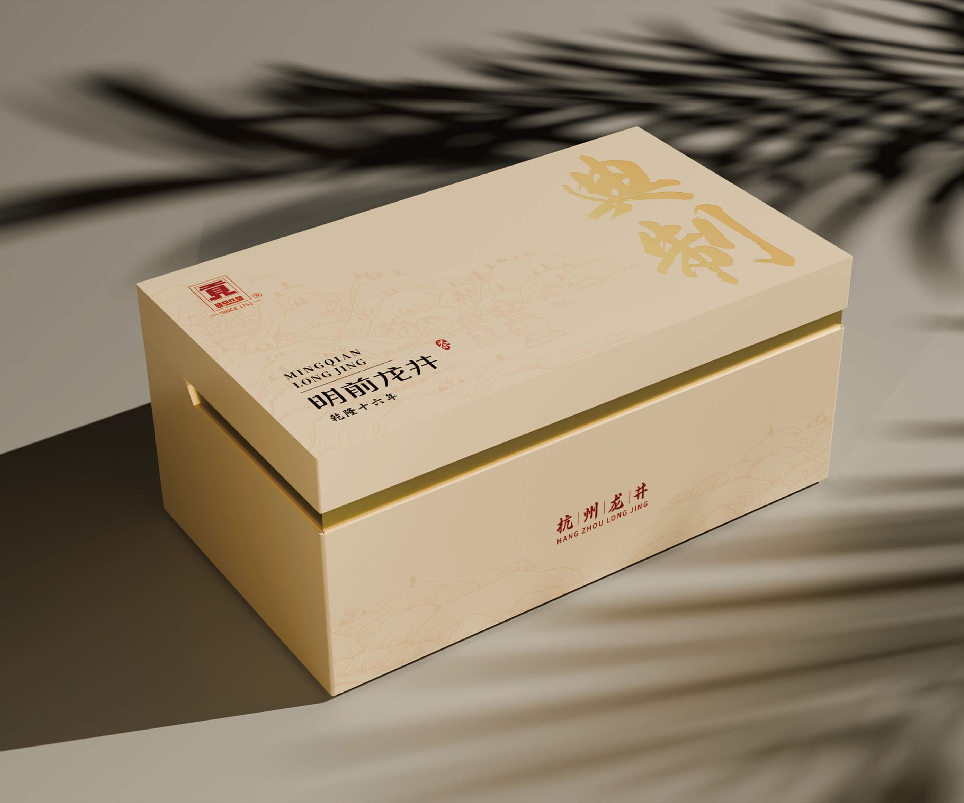 本款“典制系列西湖龍井茶明前龍井禮盒包裝”設計案例,旨在通過精致、傳統的包裝形式,展現西湖龍井茶的獨特韻味與高端品質。設計靈感來源于中國傳統茶文化,結合現代審美趨勢,力求打造一款既符合傳統審美又具現代感的禮盒包裝。