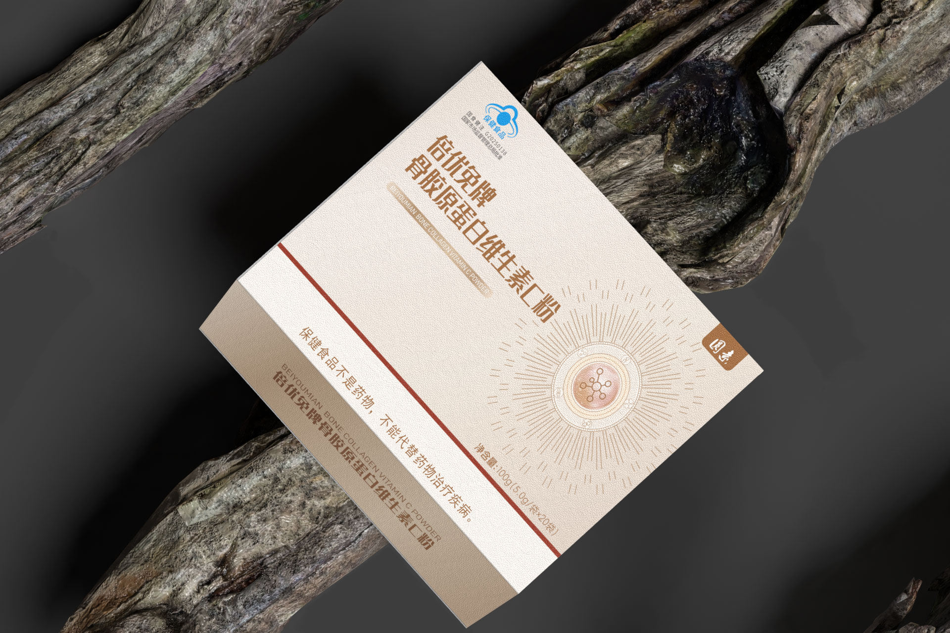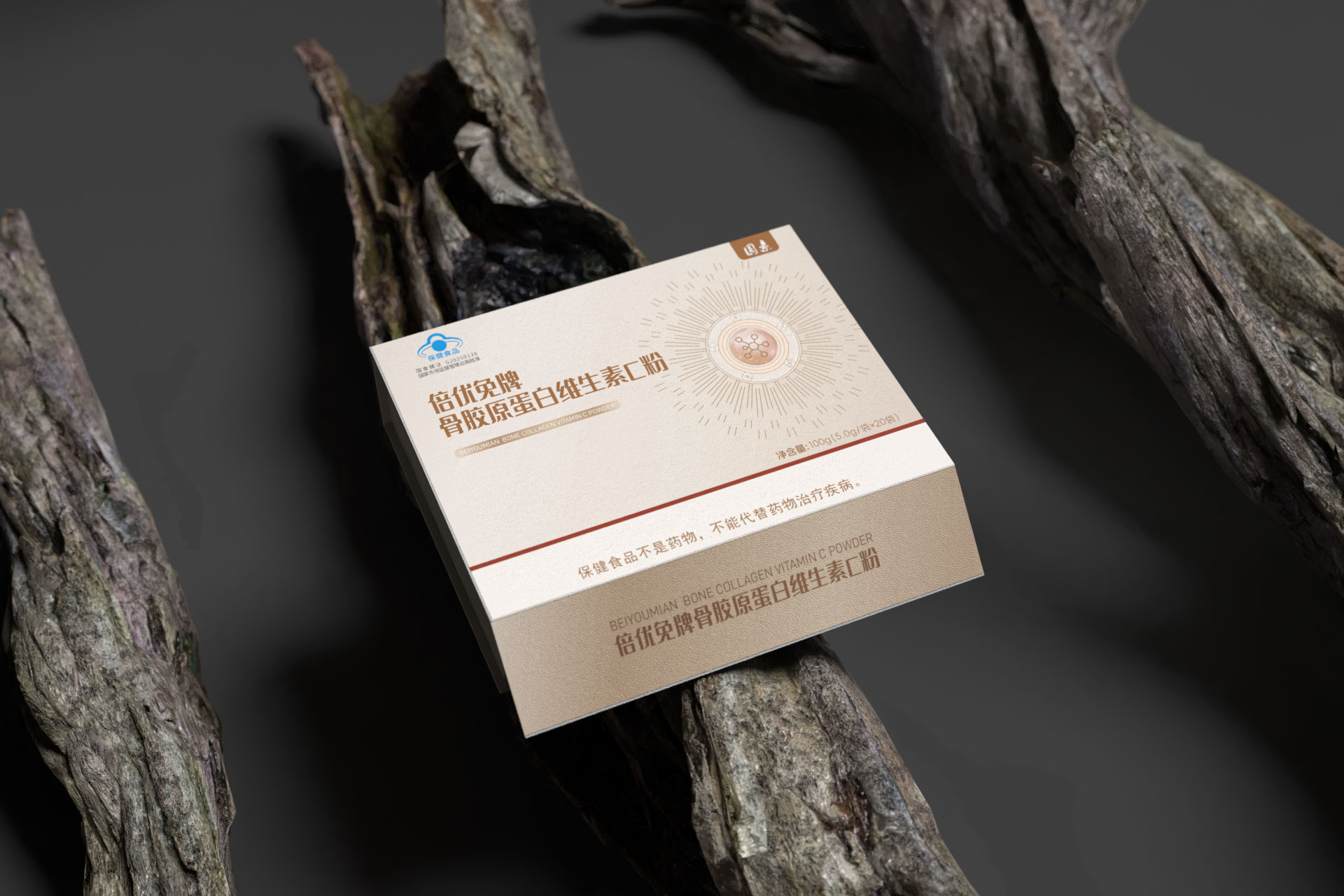 圖形符號: 設計了一個抽象的 “分子融合” 圖標,巧妙地將膠原蛋白螺旋結構與維生素C分子形態相結合,直觀傳達“科學配比,協同增效”的產品核心。